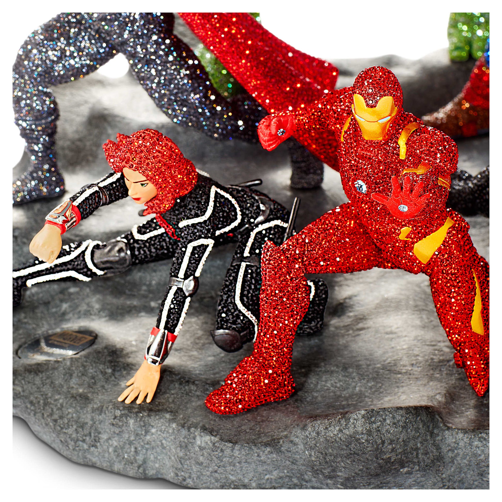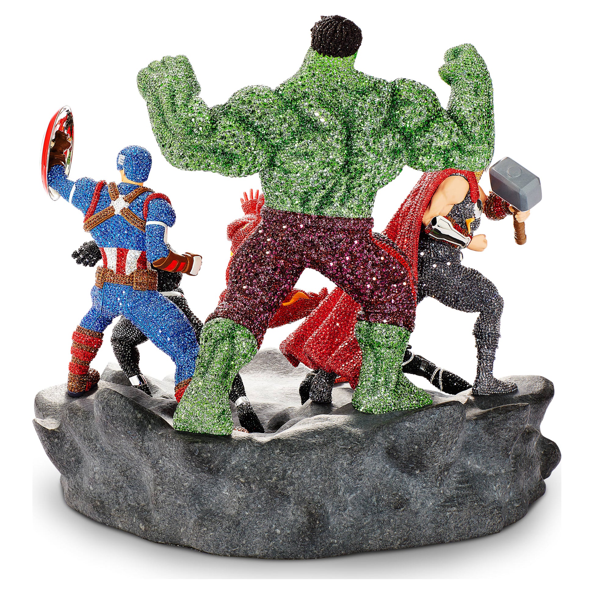 For the very first time, Swarovski has assembled a full squad of Super Heroes, all standing together in one astonishing display. Made for Marvel fans, this empowering Limited Edition creation features Thor, Black Widow, Hulk, Iron Man, Captain America, and Black Panther, each rushing to the rescue in an explosion of bright colors. The design requires 542 hours of craftsmanship and is produced with approximately 63,900 crystals, expertly set in place using the Pointiage® technique. This dramatic and dynamic Avengers scene is limited to 200 pieces and is one of the most meticulous and spectacular examples of Swarovski savoir-faire ever produced. A collectible that will inspire your adventurous side every day. Decoration object. Not a toy. Not suitable for children under 15.