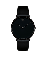 Movado.com EXCLUSIVE Modern 47, 40 mm black PVD-finished stainless steel case with black-toned dial on black leather strap.