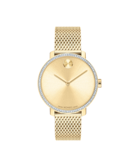 Discover true modern glamour. Crafted from pale yellow gold tone ion-plated stainless steel, this Swiss made design features a matching gold tone dial framed by a sparkling crystal-covered bezel. The 34mm case is paired with a sleek mesh bracelet and completed by our iconic dot motif.