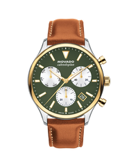 The Heritage Series Calendoplan takes a modern approach to a classic 1950's silhouette. This 43mm chronograph features a cypress green dial with white subdials, Swiss Super-LumiNova® accents, and a date window.