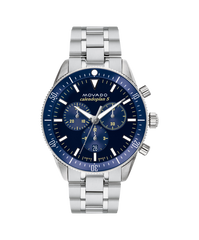 Movado Heritage Series Calendoplan Chronograph, 42 mm stainless steel case and bracelet with blue-toned dial & unidirectional rotating bezel.
