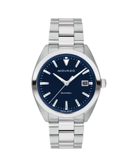 Retro-cool design defined by timeless styling and a distinctive case have defined the Datron Collection for over 50 years. Inspired by our archives, this design features a 39mm case of stainless steel housing a deep blue dial fitted with Swiss Super-LumiNova® accents and a date window.
