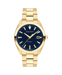 Retro-cool design defined by timeless styling and a distinctive case have defined the Datron Collection for over 50 years. Inspired by our archives, this design features a 39mm case of rich yellow gold ion-plated stainless steel housing a deep blue dial fitted with Swiss Super-LumiNova® accents and a date window.