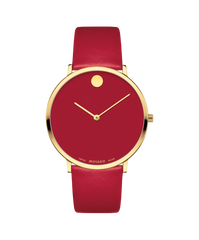 Movado Museum Dial Modern 47 watch, 40 mm yellow gold PVD-finished stainless steel case, 6.30 mm thin, with red dial and yellow gold-toned original flat dot and stick hands, red calfskin strap with yellow gold PVD-finished stainless steel classic tongue buckle.
