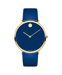 Movado Museum Dial Modern 47 watch, 40 mm yellow gold PVD-finished stainless steel case, 6.30 mm thin, with blue dial and yellow gold-toned original flat dot and stick hands, blue calfskin strap with yellow gold PVD-finished stainless steel classic tongue buckle.
