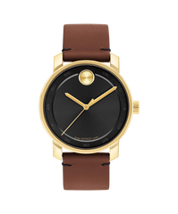 Movado BOLD Access, 41mm yellow gold ion-plated stainless steel case with black dial, yellow gold-toned dot & hands on a cognac strap.