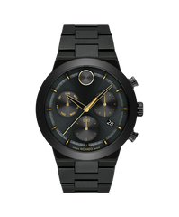 Movado BOLD Fusion, 44mm black ion-plated stainless steel case and bracelet with a black and pale yellow gold accented chronograph dial, ceramic bezel, and date window detailing.