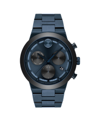 Movado BOLD Fusion, 44mm blue ion-plated stainless steel case and bracelet with a blue and black accented chronograph dial, ceramic bezel and date window detailing.
