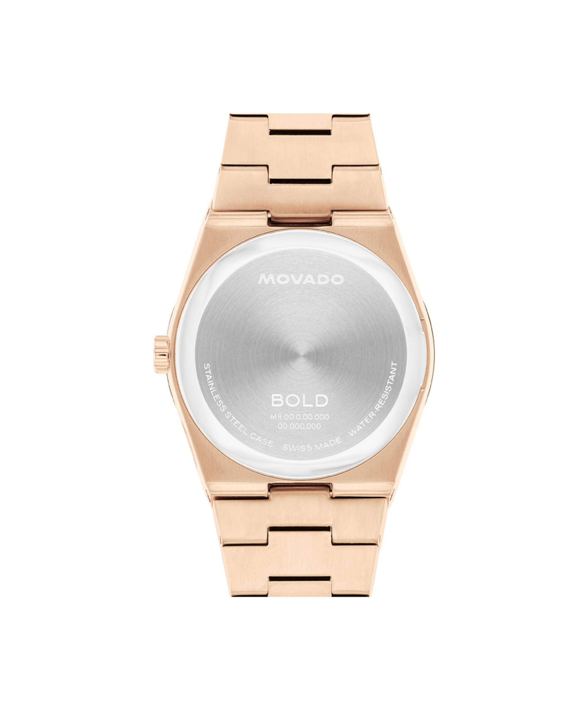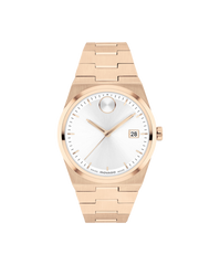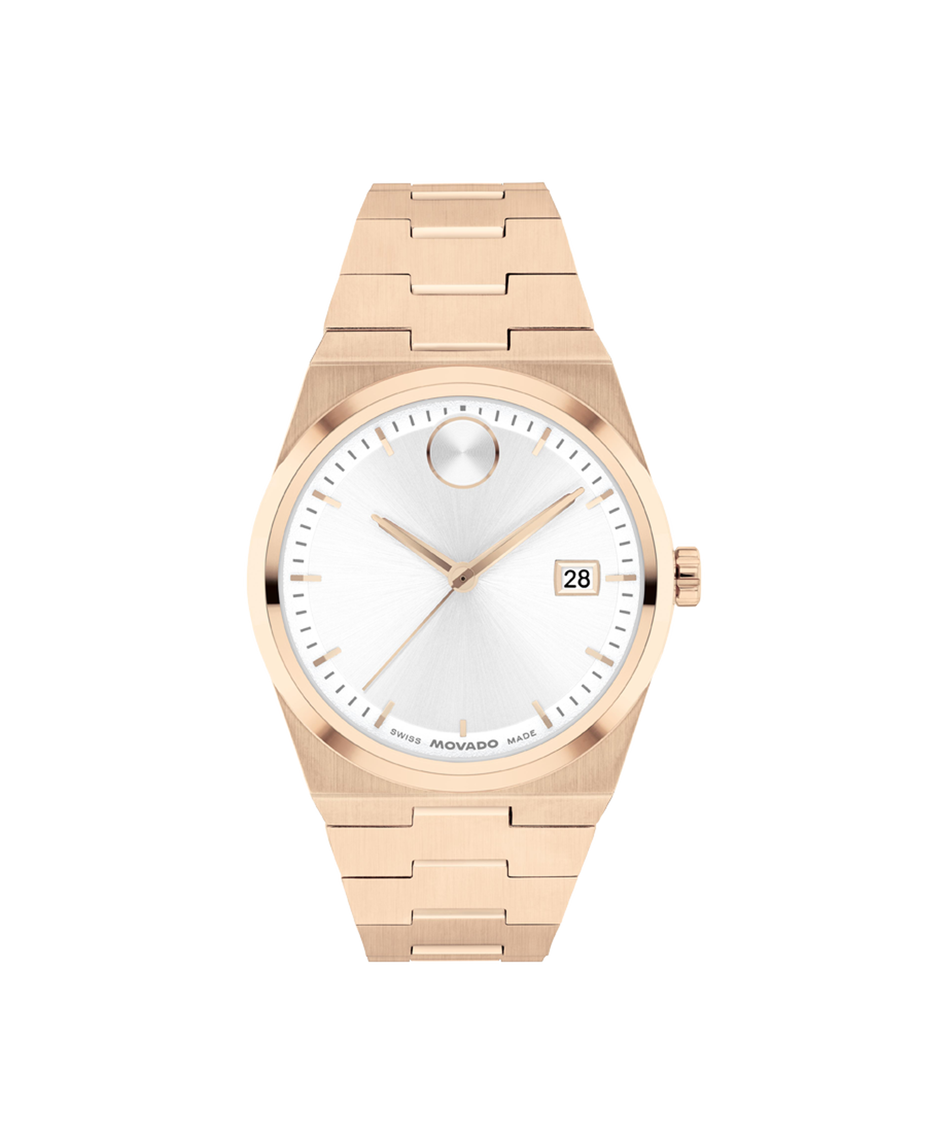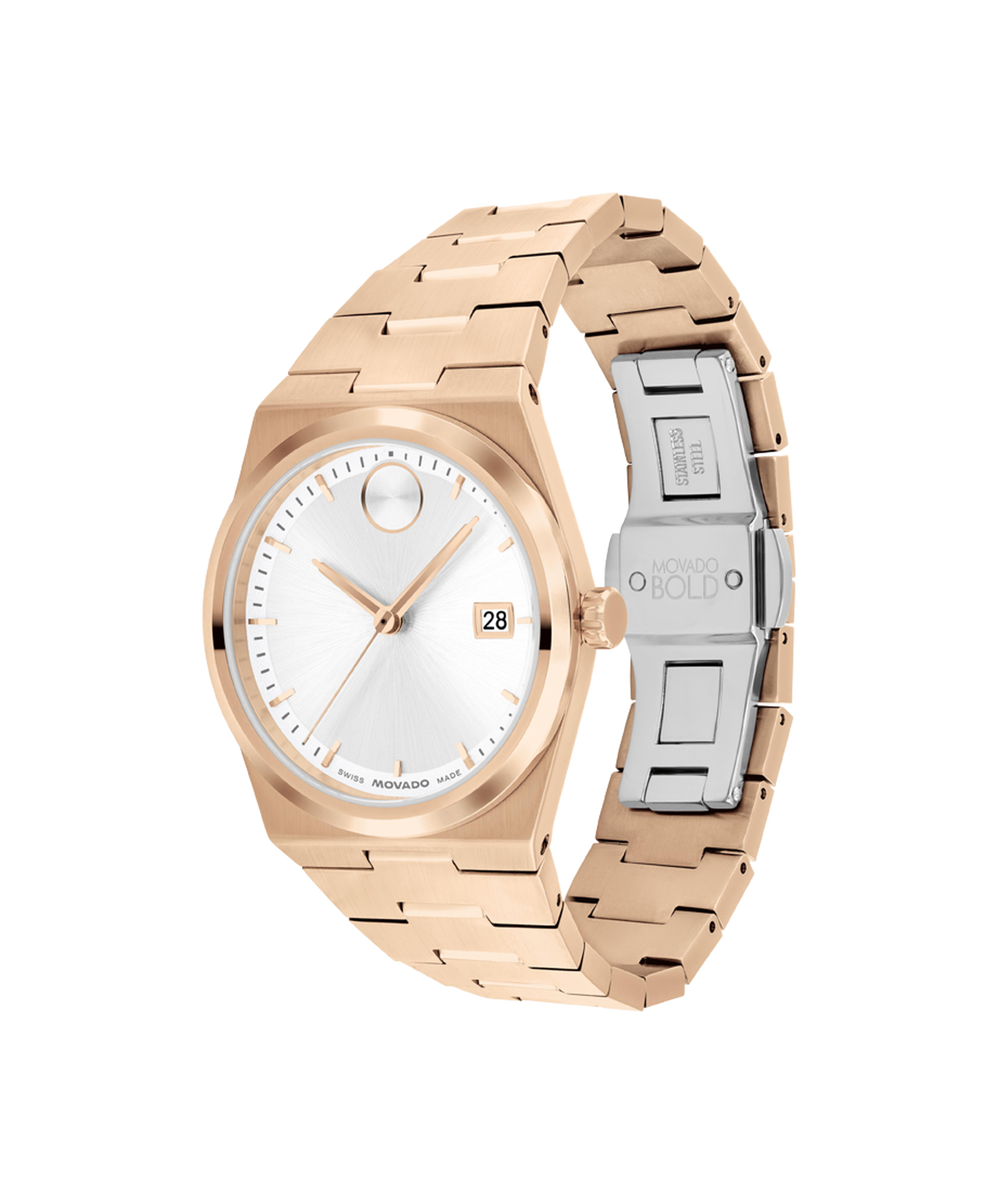 The BOLD Quest looks to the future with a shaped case and an integrated bracelet. This 35mm watch features a white dial, rose gold tone hands, and our signature dot at 12 o'clock.