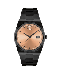 The BOLD Quest looks to the future with a shaped case and an integrated bracelet. This 40mm watch features a rose gold sunray dial, black hands, and our signature dot at 12 o'clock.