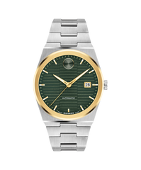 The BOLD Quest Automatic looks to the future with a shaped case and an integrated bracelet. A Swiss made self-winding movement drives this watch, powered by the motion of your wrist. This 39mm watch features a green dual texture dial, yellow gold-tone hands, an exhibition case back, and our signature dot at 12 o'clock.