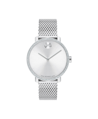 Discover true modern glamour. Crafted from stainless steel, this Swiss made design features a matching silver tone dial framed by a sparkling crystal-covered bezel. The 34mm case is paired with a sleek mesh bracelet and completed by our iconic dot motif.
