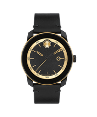 Ultra-modern design defined by pops of color and sporty style. Go cool and contemporary in this black TR90 timepiece with pale yellow goldtone accents. The 42mm case houses a black dial with black Swiss Super-LumiNova accents and a date window.