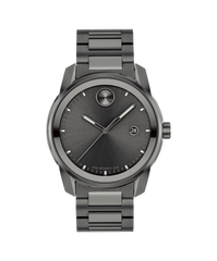 Movado BOLD Verso, 42 mm gunmetal ion-plated stainless steel case and bracelet with gunmetal metallization. Features a gunmetal-toned dial, Swiss Super-LumiNova® accents, and date window detailing.