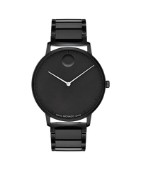 Movado Face, 41mm black ion-plated stainless steel case and bracelet with a black dial and white-toned hands.