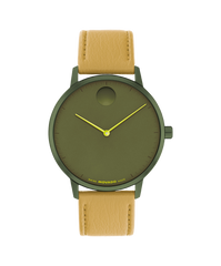 Movado.Com Exclusive -The Face Collection explores modern minimalism through the art of color. This 41mm two-hand watch features an olive dial, slim yellow hands, a khaki leather strap, and our oversized recessed dot at 12 o'clock.