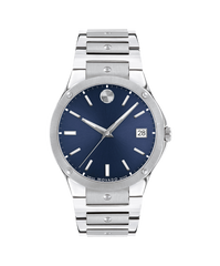 Movado S.E., 41mm dual finished stainless steel case and bracelet with silver concave polished dot accents and blue sunray dial. Features Sapphire crystal, date window detailing, and Swiss Super-LumiNova® hands, hour markers & indices at 6:00 and 9:00.