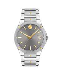 Movado SE, 41mm dual finished stainless steel case and bracelet with yellow gold PVD-finished concave polished dot accents and mid-grey sunray dial. Features Sapphire crystal, date window detailing, and Swiss Super-LumiNova® hands, hour markers & indices at 6:00 and 9:00.