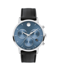The Museum Classic is the purest interpretation of Movado's Museum Dial—an icon of modern design featured in art institutions around the world. This 42mm chronograph watch features a steel blue dial with tonal subdials, a black leather strap, and our signature dot at 12 o'clock.