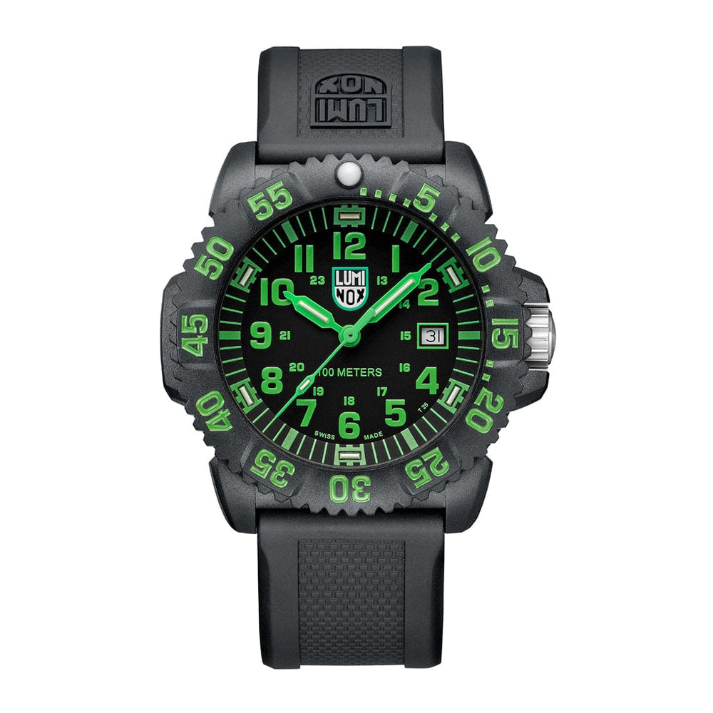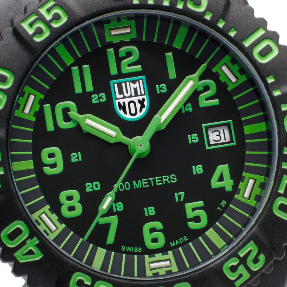 Known for their agility and fluid movements, the dynamic Sea Lion serves as inspiration for the Green Shield Sea Lion collection. A streamlined 44mm CARBONOX™ case is durable and light weight, with 100 meters water resistant. The perfect companion for water activities, this watch is unique thanks to its protected crown and dive bezel. A Black PU strap with a stainless steel signature buckle compliments a lively black-and-green dial. Proven Luminox Light Technology lighting system provide self-powered readability in any situation. "Always Visible", for up to 25 years.