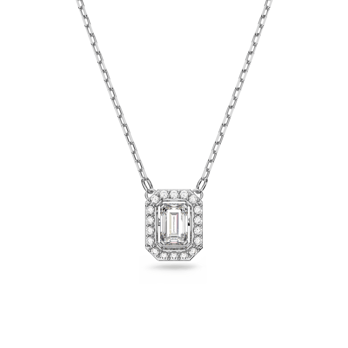 Designed to form a striking octagon shape, this pendant necklace will become one of the hardest working pieces in your wardrobe. A delicate rhodium plated chain holds a clear step cut stone at its center, which moves as you wear it, and is framed by smaller brilliant cut stones. Endlessly versatile, wear it with a white T-shirt for a subtle statement, or layered with other necklaces for a more dramatic look. This necklace is part of the Millenia family, designed by Creative Director Giovanna Engelbert for Collection I.