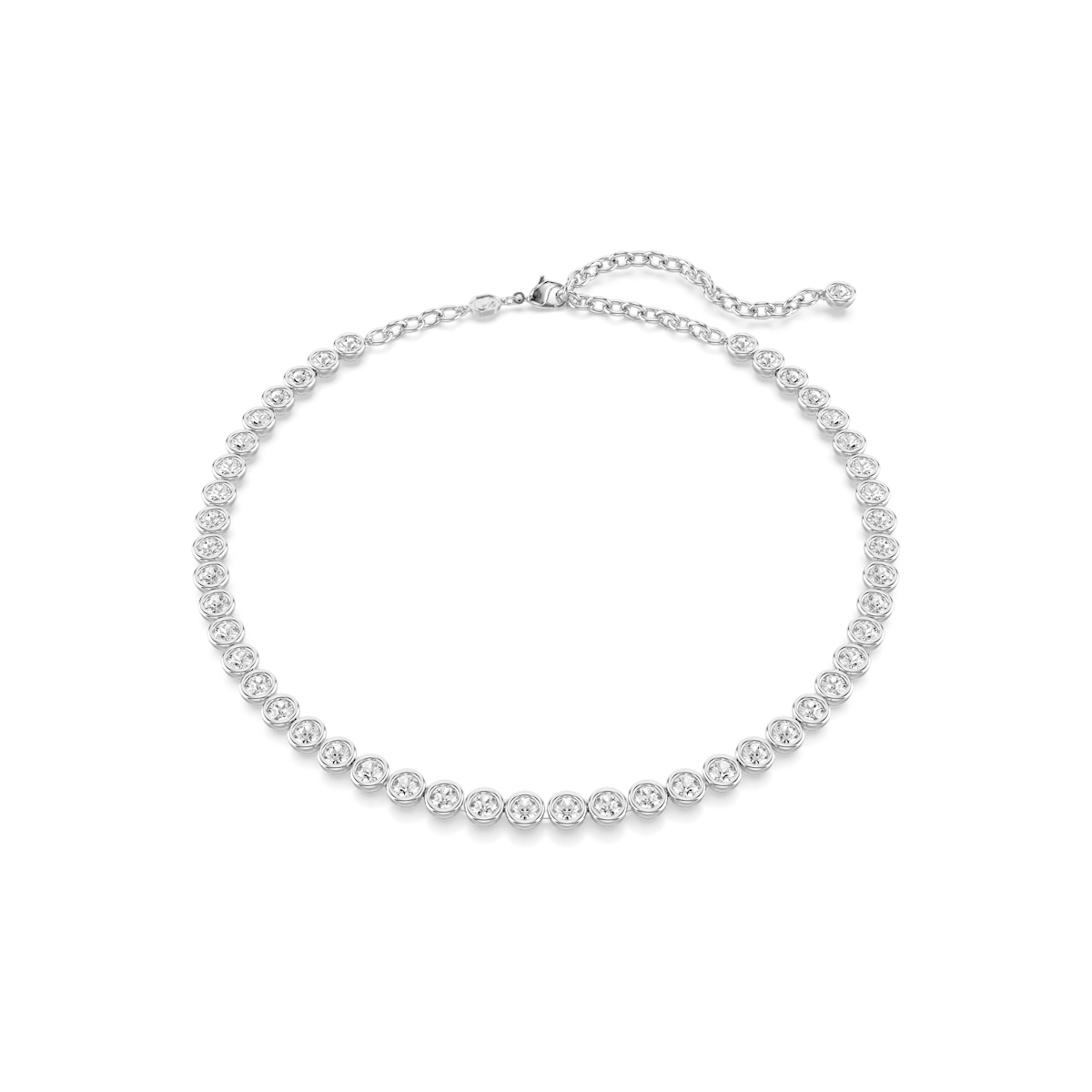 Crafted with a timeless mix of subtle tones, this Imber Tennis necklace is a go-to piece for everyday styling. The rhodium-plated design features an all-around strand of round-cut crystals in a puffy bezel setting. A great choice when your look needs some extra glow.