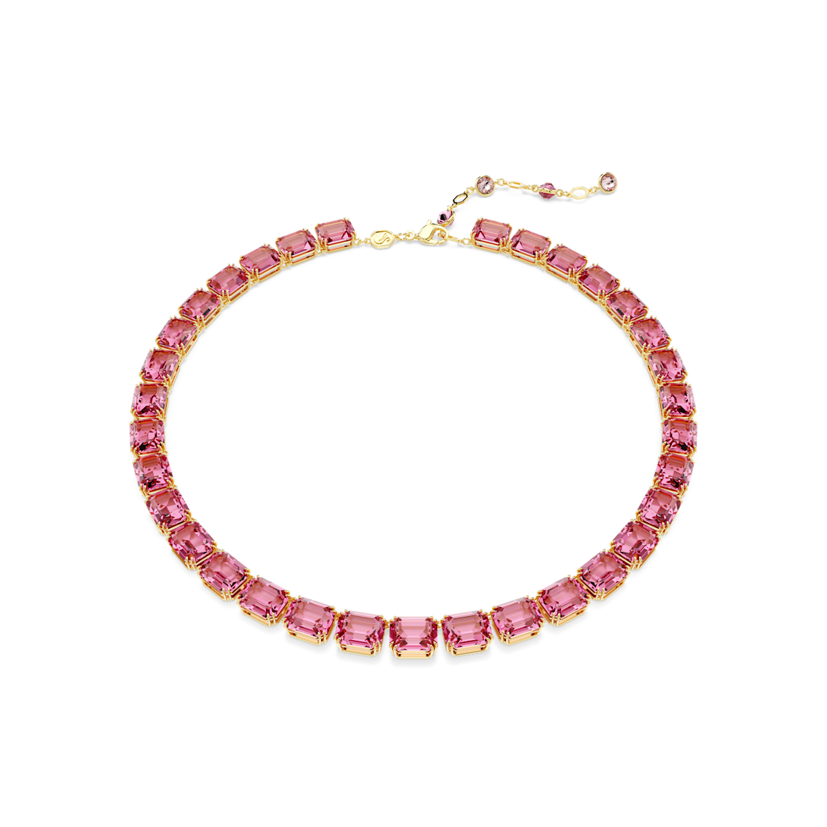 This striking necklace is perfectly crafted with uniform, octagon-cut pink crystals on a gold-tone plated prong setting. It is finished with a lobster closure and an elongation of round crystals in a vintage pink color. An elegant wardrobe essential, this piece can be worn on its own for an ultramodern daytime look or teamed with a Millenia bracelet for chic evening adornment.