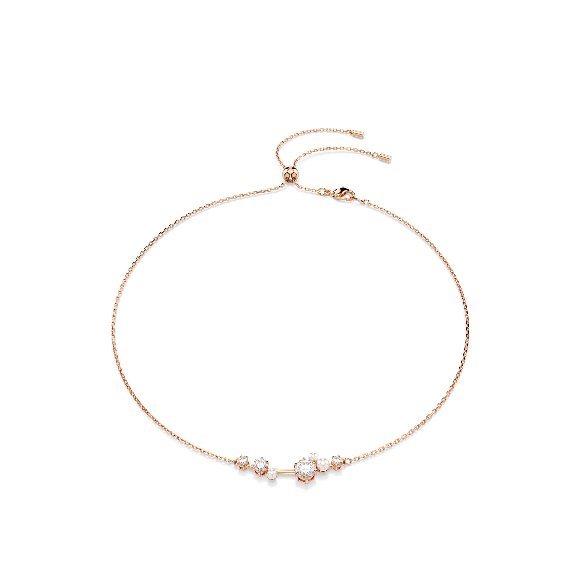 Launch your style into the stars with this versatile Constella creation. The rose gold-tone plated design features a special pulling mechanism, allowing you to wear the jewelry as a necklace or a choker. At the front, the different-sized Swarovski Zirconia and Swarovski Crystal Pearls almost seem to float among the discreet articulations, producing a look of cosmic wonder. Play with the different styling possibilities and wear it alongside a matching ring for endless reflections of light.