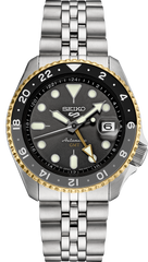 Seiko 5 Sports SKX GMT U.S. Special Creation. Adding new richness to classic sport/dress design, this stylish watch delivers all-day versatility with a cutting edge. With its GMT function and stylish five-row bracelet, this dynamic watch offers a new variation on the popular "SKX" style. Equipped with automatic technology that you control with every movement, this versatile timepiece is powered by a 24-jewel movement that beats at a frequency of 21,600 vibrations per hour, with a power reserve of approximately 41 hours and manual winding capability. The first SKX design to offer a two-tone case, this exceptional watch features a charcoal gray dial with bold luminous hands and markers, and a magnified date calendar, as well as a large gold-tone GMT hand for easy second time zone tracking. Crafted of stainless steel in two-tone finish, with a bi-color 24-hour GMT bezel, tri-fold push button release clasp and lock, and a screwdown see-through caseback for a view of classic timekeeping in action. 10 bar, 100M Water Resistant