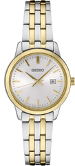 From the Essentials Collection. Offering classic designs, the Essentials Collection provides the ideal solution for all-day wear. Crafted of stainless steel in versatile two-tone finish, this perfectly tailored watch features a contemporary minimalist white dial with gold hands and markers, as well as a date calendar, for a superb blend of clarity and style. 5 bar, 50M Water Resistant