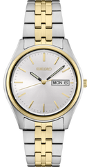 From the Essentials Collection. Offering classic dress/sport designs, the Essentials Collection provides the ideal solution for everyday wear. Crafted of stainless steel in versatile two-tone finish, this perfectly balanced watch features a white sunray dial with day/date calendar and sleek gold stick markers for a superb blend of clarity and style. 10 bar, 100M Water Resistant