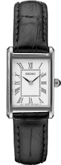 From the Essentials Collection. Offering classic designs, the Essentials Collection provides the ideal solution for everyday wear. Crafted of stainless steel, this elegant watch, with sophisticated rectangular case, features a traditional white dial with Roman numerals and finely shaped hands, cabochon crown and black leather strap for perfect day-to-evening style. 3 bar, 30M Water Resistant