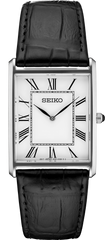 From the Essentials Collection. Offering classic designs, the Essentials Collection provides the ideal solution for everyday wear. Crafted of stainless steel, this elegant watch, with sophisticated rectangular case, features a traditional white dial with Roman numerals and finely shaped hands, cabochon crown and black leather strap for perfect day-to-evening style. 3 bar, 30M Water Resistant