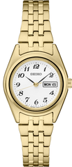 From the Essentials Collection. Offering classic dress/sport designs, the Essentials Collection provides the ideal solution for everyday wear. Crafted of stainless steel in gold-tone finish, this perfectly balanced watch features a white dial with Arabic numerals and day/date calendar for a superb blend of clarity and style. 10 bar, 100M Water Resistant