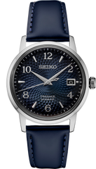 Seiko Presage Cocktail Time. Offering the finest in Japanese mechanical watchmaking, the Presage Collection blends precision technology with superior craftsmanship and design. Taking a more playful approach to the popular Cocktail theme line, this delightful watch is part of a group reflecting the casual charm of a vacation bar. Inspired by the Old Clock cocktail, its gradated deep blue dial features a pressed pattern reminiscent of the light reflected by a classic cocktail glass, as well as numerals styled to recall the printing on a vintage liquor label. The 23-jewel movement, with manual and automatic winding capability, beats at a frequency of 21,600 vibrations per hour, with a power reserve of approximately 41 hours. Crafted of stainless steel, this distinctive timepiece includes a calendar, box-shaped crystal, screwdown see-through caseback, smooth blue leather strap and tri-fold push button release clasp. 5 bar, 50M Water Resistant