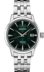 From the Presage Cocktail Time Collection. Offering the finest in Japanese mechanical watchmaking, the Presage Collection blends precision technology with superior craftsmanship and design. Inspired by the delights of a cocktail bar, this sophisticated watch features a green dial with pressed pattern, gloss finish and date calendar. The 23-jewel movement, with manual and automatic winding capability, beats at a frequency of 21,600 vibrations per hour, with a power reserve of approximately 41 hours. Crafted of stainless steel, this elegant timepiece includes a box-shaped crystal, screwdown see-through caseback, and double deployment clasp with push button release. 5 bar, 50M Water Resistant