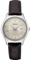 From the Essentials Collection. Offering classic dress/sport designs, the Essentials Collection provides the ideal solution for everyday wear. Crafted of stainless steel, this perfectly tailored watch features a patterned antique white dial with date calendar, as well as Arabic numerals and stick markers, for a superb blend of clarity and style. With brown leather strap and a sapphire crystal for superior scratch resistance. 10 bar, 100M Water Resistant
