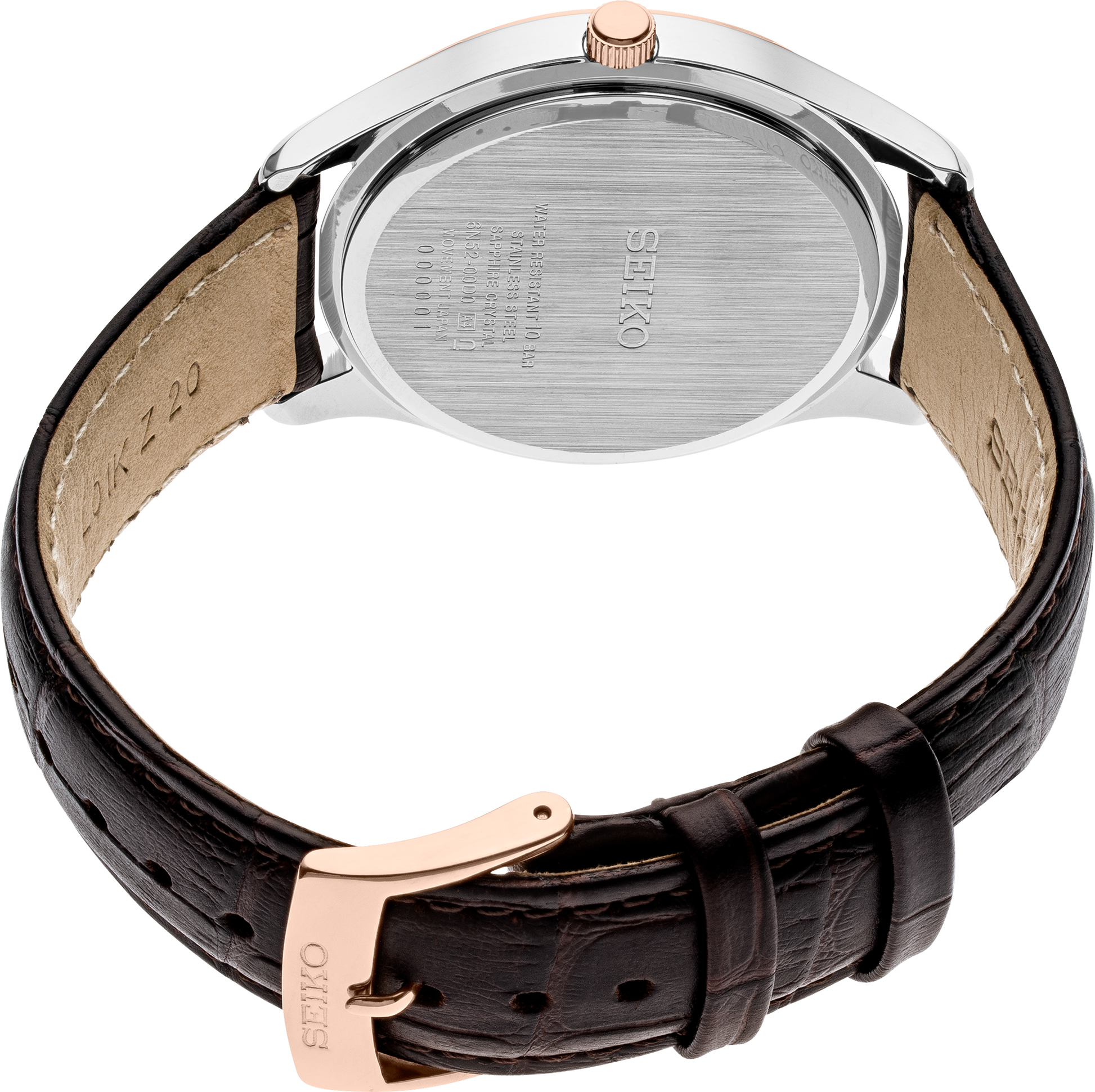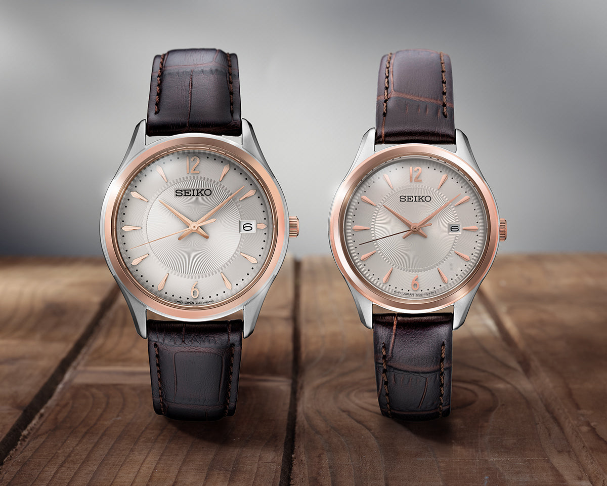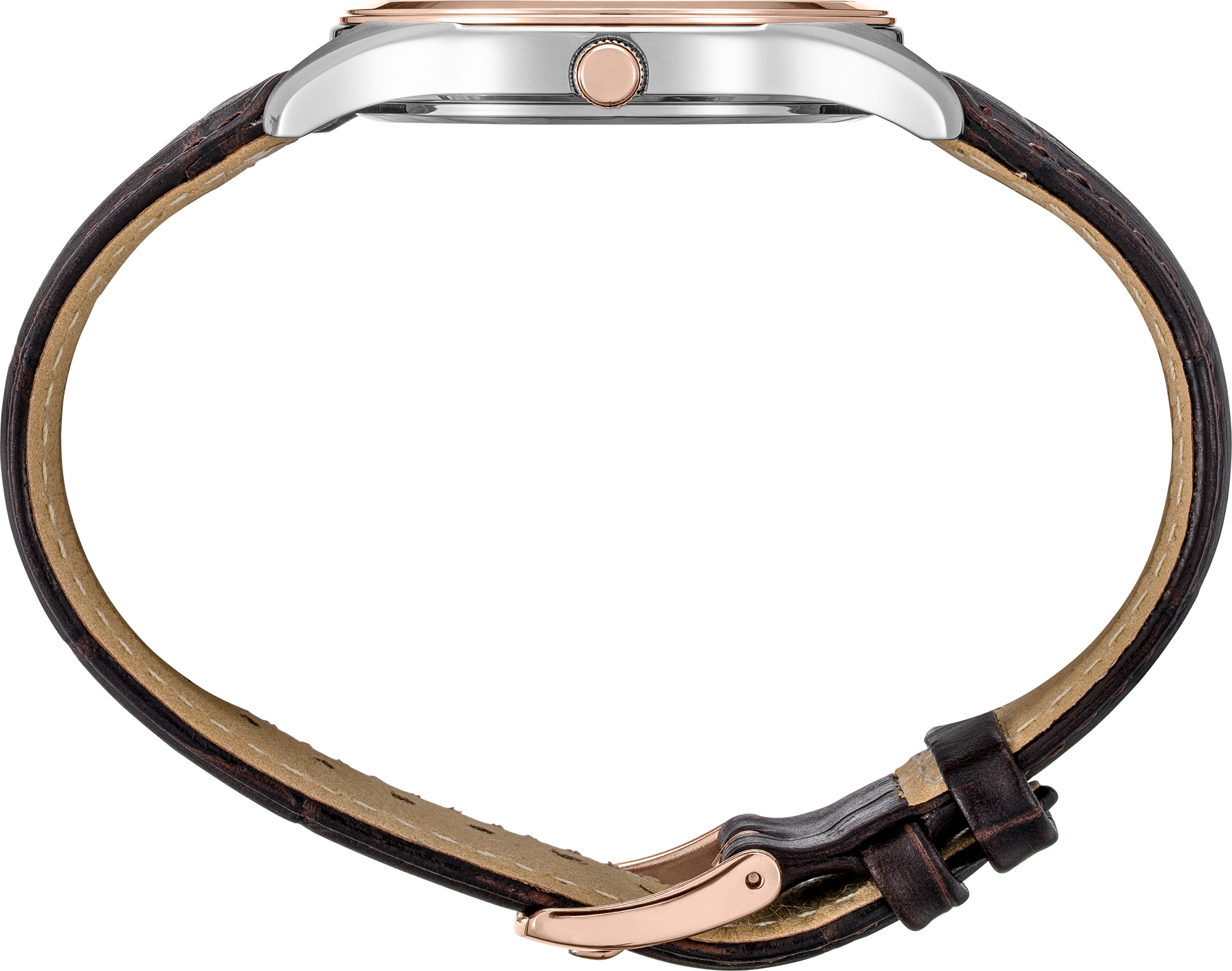 From the Essentials Collection. Offering classic dress/sport designs, the Essentials Collection provides the ideal solution for everyday wear. Crafted of stainless steel in two-tone rose gold finish, this perfectly tailored watch features a patterned silver dial with date calendar, as well as rose gold Arabic numerals and stick markers, for a superb blend of clarity and style. With brown leather strap and a sapphire crystal for superior scratch resistance. 10 bar, 100M Water Resistant