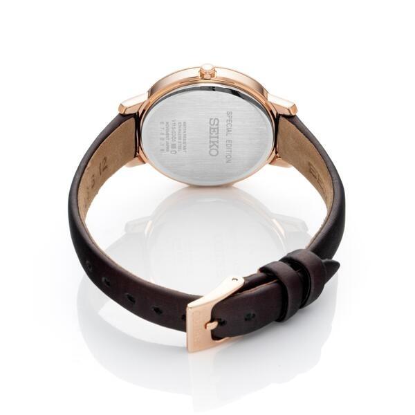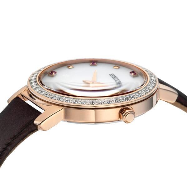 From the Crystal Collection. Unmistakably sparkling, this vibrant crystal design features a full Swarovski® crystal set bezel. The surprising touch of red Swarovski®crystal markers on a mother-of-pearl dial with a subtle four-clover motif, plus the matching satin-finish burgundy leather strap, makes it a natural for special gift giving. Rose gold hands and markers complement the rich rose gold finish of the sleek stainless steel case. The energy-efficient Solar Cell, powered by any light source, with no battery change required, provides a 12-month power reserve when fully charged. 5 bar, 50M Water Resistant Swarovski® is a registered trademark of Swarovski® AG.