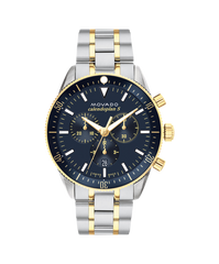 Movado Heritage Series Calendoplan Chronograph, 42mm stainless steel and pale yellow gold ion-plated case and bracelet with a navy blue chronograph dial & unidirectional bezel.