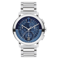 The BOLD Evolution 2.0 is defined by an elevated, bold case and a skeleton dial. This 42mm chronograph watch features a transparent blue dial with steel subdials, slim hands, and our signature dot at 12 o'clock