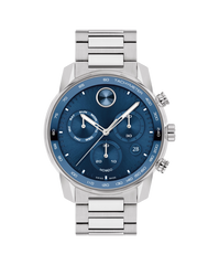 Movado.com EXCLUSIVE Movado BOLD Verso Chronograph, 44 mm stainless steel case and bracelet with tachymeter scale. Features a blue chronograph dial, Swiss Super-LumiNova® accents, and date window detailing.