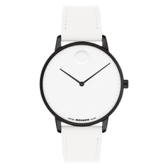 The Face Collection explores modern minimalism through the art of color. This 39mm two-hand watch features a white dial, slim black hands, and our oversized recessed dot at 12 o'clock.