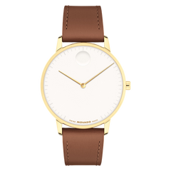 The Face Collection explores modern minimalism through the art of color. This 39mm two-hand watch features a white dial, slim yellow gold tone hands, and our oversized recessed dot at 12 o'clock. Also available in a 41mm case size.