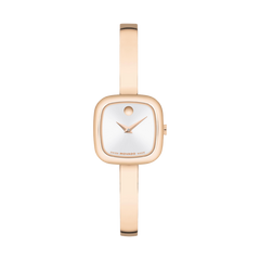 Modern, minimal, and made to stack. The Jewelry-Inspired Movado Museum Bangle. This 21.5mm watch features a cushion silver white sunray dial, rose gold tone dauphine hands, and our signature dot at 12 o'clock