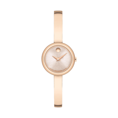 Modern, minimal, and made to stack. The Jewelry-Inspired Movado Museum Bangle. This 21.5mm watch features a round warm grey radial shimmer dial, rose gold tone dauphine hands, and our signature dot at 12 o'clock