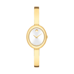Modern, minimal, and made to stack. The Jewelry-Inspired Movado Museum Bangle. This 21.5mm by 25.5mm watch features an oval silver white sunray dial, yellow gold tone dauphine hands, and our signature dot at 12 o'clock