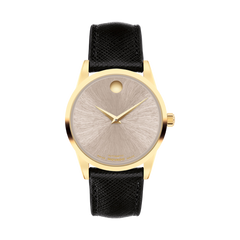 The Museum Classic is the purest interpretation of Movado's Museum Dial—an icon of modern design seen in art institutions around the world. A Swiss made self-winding movement drives this watch, powered by the motion of your wrist. This 33mm two-hand watch features a warm grey sunburst shimmer dial, yellow gold tone dauphine hands, and our signature dot at 12 o'clock