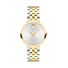The Museum Classic is the purest interpretation of Movado's Museum Dial—an icon of modern design seen in art institutions around the world. This 29.5mm watch features a silver white sunray dial, yellow gold tone dauphine hands, and our signature dot at 12 o'clock.