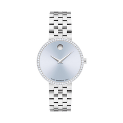 The Museum Classic is the purest interpretation of Movado's Museum Dial—an icon of modern design seen in art institutions around the world. This 29.5mm watch features an ice blue sunray dial, steel dauphine hands, lab-grown diamond pavé bezel, and our signature dot at 12 o'clock.